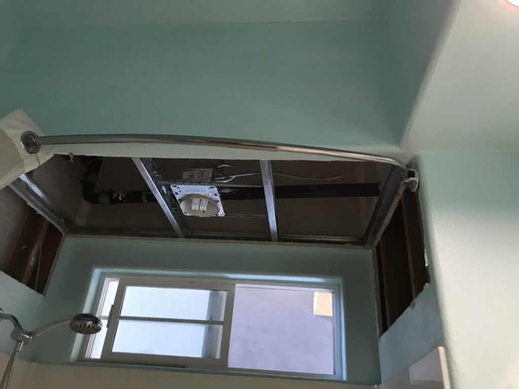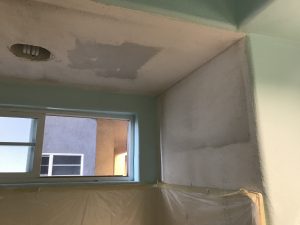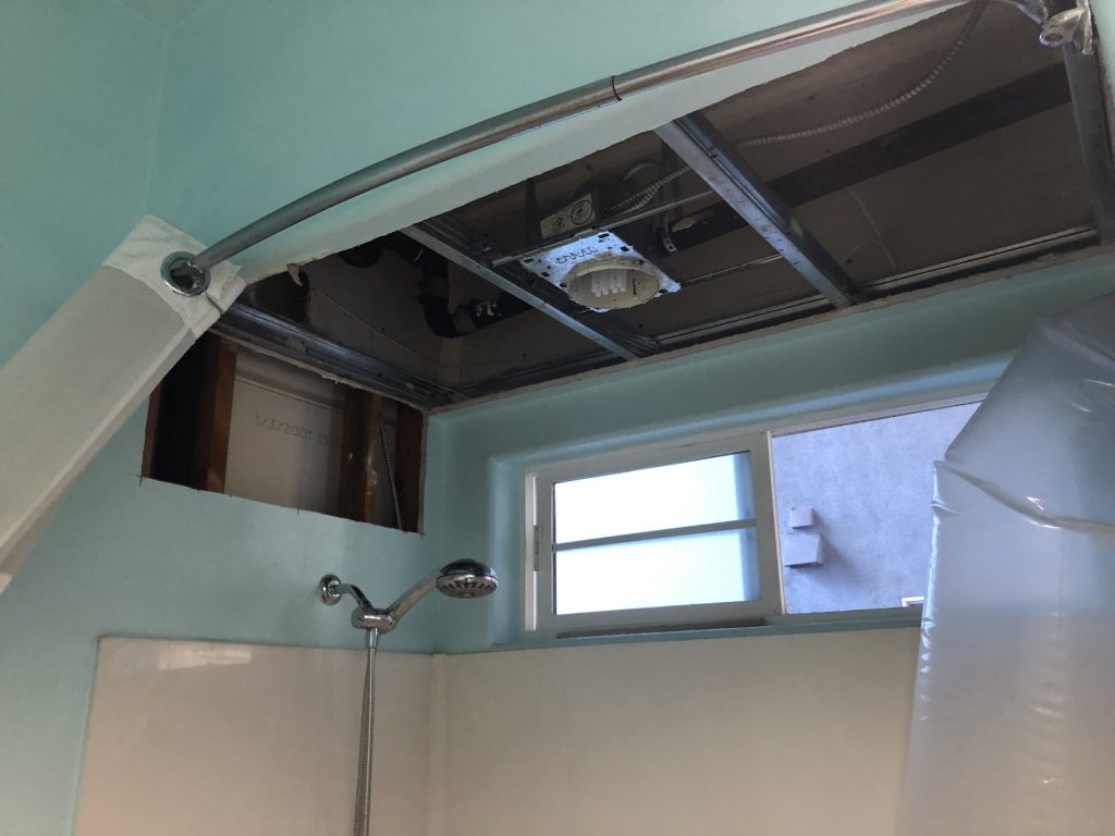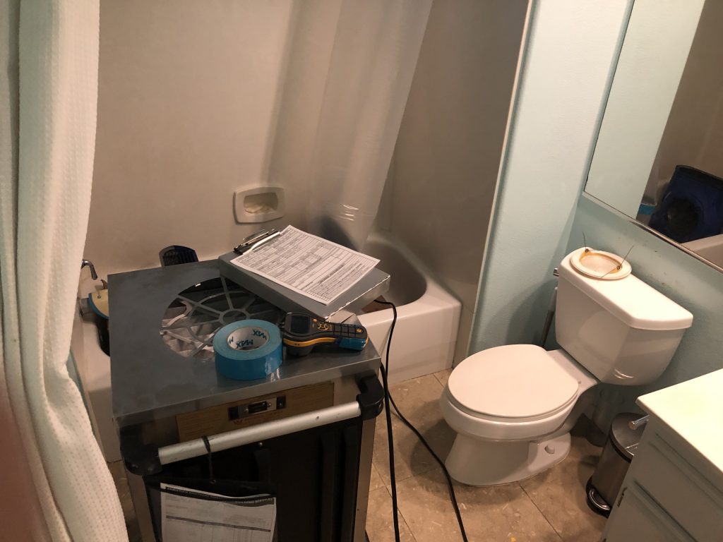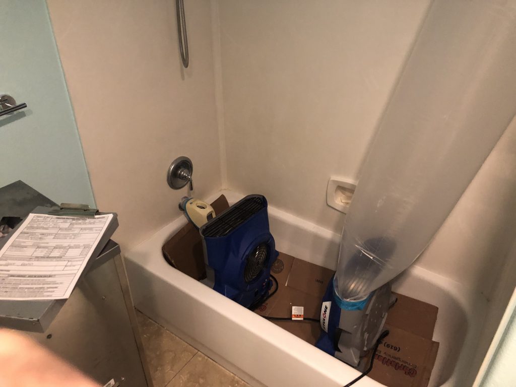 Water Damage had traveled from a pipe leak in the upstairs neighboring unit to the residence below. Our Mitigation Crew had to open walls in the bathroom to remove wet drywall and insulation to sanitize. Drying equipment was strategically set up and left to run for a few days. The team would be monitoring throughout the process to measure moisture levels and ensure optimal drying time. Once the area was dried out properly, our Repairs Team was able to hang drywall, texture and paint.