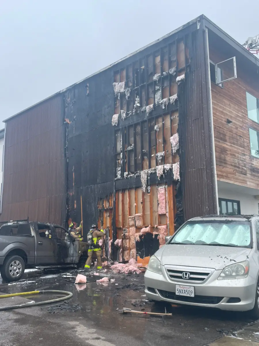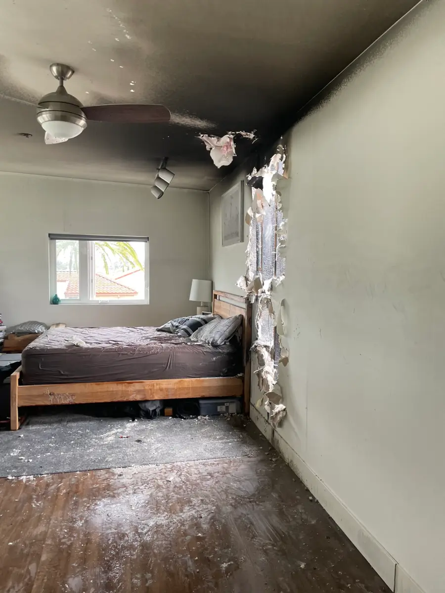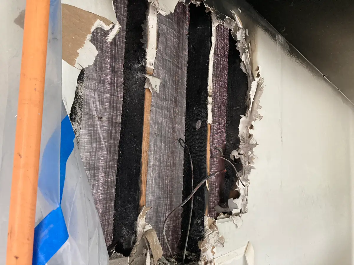 A truck caught fire in the parking lot next to the building and spread to the building. Our team was dispatched to meet with the building property manager, and the insurance adjuster to go over the next steps. The fire department was on site still putting out any source that could lead to more flames. We assisted with cleaning the water left by the fire department, drying it out, assisting with the repairs and permitting with the city, and getting electrical repairs needed for the rebuild.