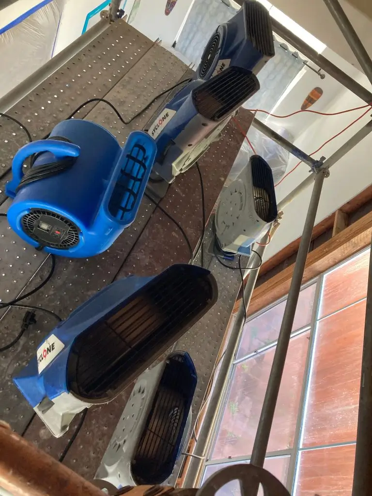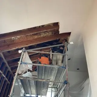 We received a call during the early heavy rains of January/February 2024; the homeowner let us know the roof started leaking in the entryway from the rains. They have high vaulted ceilings, and the water is dripping from the ceiling down the wall and coming through the window. The Homeowner had towels soaking it up the water. They also have solar panels above this area, but the solar company said their warranty was only for one year, and they got it eight years ago. They have a contractor friend who has a referral for a roofer. We encouraged the homeowner to contact that referral so that more damage does not occur. We assisted with the dry-out and removal of the affected materials on the ceiling and around the window.